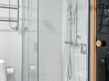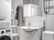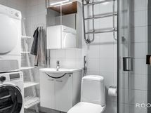 - Pesutilojen varusteet: Suihku, wc-istuin, suihkuseinä, pesukoneliitäntä, peilikaappi, allaskaappi, bidee-suihku ja lattialämmitys.