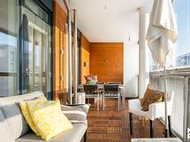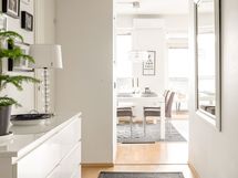 Kylpyhuoneen yhteydessä on käytännöllinen kodinhoitopiste, jossa on tila pesukoneelle tai pesutornille. Ikkuna tuo tilaan luonnonvaloa ja lisää tilan viihtyisyyttä. Hyvin suunniteltu tilaratkaisu tekee arjen askareista sujuvia. Erillisen WC:n kuvaus: Asunnossa on erillinen WC, joka lisää arjen sujuvuutta ja käytännöllisyyttä. Tilassa on wc-istuin, käsienpesuallas sekä peilikaappi integroidulla valaistuksella. Varusteluun kuuluu lisäksi bidee-suihku.