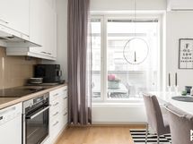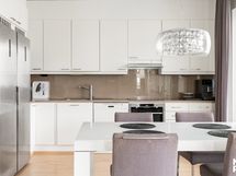 Keittiön varustelu palvelee nykyaikaisia tarpeita: täyskorkea jääkaappi ja pakastin, erillisuuni, induktiotaso, liesituuletin sekä astianpesukone.