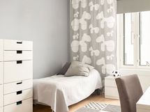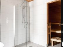 Varusteluun kuuluu suihkuseinä, peili valaisimella sekä allaskaappi, joka tarjoaa säilytystilaa kylpyhuonetarvikkeille. Lattioissa on mukavuutta lisäävä vesikiertoinen lattialämmitys.