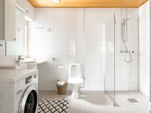 - Pesutilojen kuvaus: Kylpyhuone on tilava ja selkeälinjainen kokonaisuus, jossa vaaleat laattapinnat yhdistyvät hillittyihin harmaan sävyihin. Reilunkokoinen pesutila tarjoaa hyvin tilaa arjen toiminnoille ja tekee kokonaisuudesta toimivan sekä käytännöllisen.