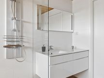- Suihku/suihkuseinä, kylpyamme, pesukoneliitäntä, wc-istuin, suihku x 2, peili, kiinteät valaisimet, pyykkikaappi, allaskaappi, kuivauspatteri, sähkökiuas