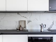 Valkoista kaapistoa, kiinteä valaisin, astianpesukone (Siemens), keraaminen sähköliesi