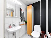 Yläkerran kph: wc, suihku, peilikaappi, käsienpesuallas, lattialämmitys. Erillisten WC:n lukumäärä: 1. Erillisen WC:n kuvaus: Alakerrassa erillinen wc. Lattia: muovimatto. lattialämmitys. Seinät: maalattu ja yksi seinä laatoitettu. Peilikaappi, käsienpesuallas, wc, korkea kaappi, seinäpeili.