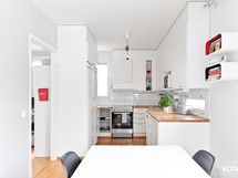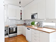 - Keittiön varusteet: Jääkaappi, uuni, astianpesukone, liesituuletin ja erillinen pakastin. Työtason materiaali: Puu. Välitila laatoitettu.