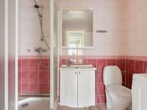 - Suihku, Pesukone, Pesukoneliitäntä, Tilaa pesukoneelle, Käsisuihku, Kaapisto, Allas, WC-istuin, Peili, Suihkukaappi