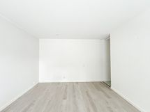 Valoisa keittiö tarjoaa runsaasti säilytystilaa ja suuri ikkuna tuo tilaan luonnonvaloa. Olohuone on tilava ja helposti sisustettavissa – sinne mahtuu luontevasti sekä ruokapöytä että viihtyisä oleskelualue.