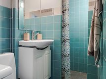 - Kylpyhuone, suihku, kaapit, allaskaappi, pesukoneliitäntä, kiinteät valaisimet.