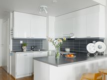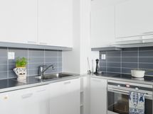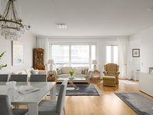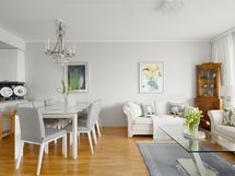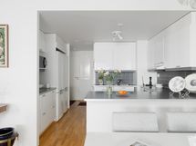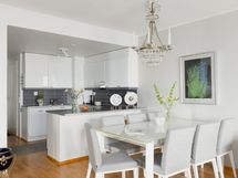 Olohuone ja keittiö muodostavat kutsuvan yhteisen tilan, jossa arki ja juhla sulautuvat luontevasti yhteen. Keittiössä yhdistyvät käytännöllisyys ja selkeälinjainen estetiikka - tilaa on kokata, seurustella ja olla yhdessä. Ruokapöydälle jää reilusti tilaa ja kokonaisuus tuntuu ilmavalta ja toimivalta arjen eri hetkissä.