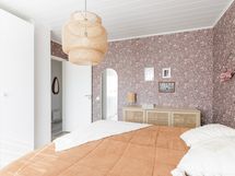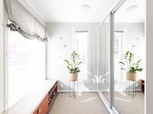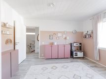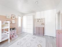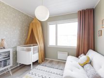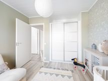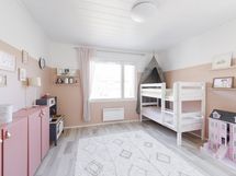 Yläkerran kylpyhuoneessa wc, suihkuseinät, peili allaskaapistot, pesukoneliitäntä (pesukoneelle paikka allastason ovien takana), seinään kiinnitetyt kaapistot, ranskalainen parveke, lattialämmitys.