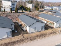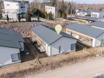Samassa yhteydessä tekninen tila. Seinät maalattu, laattalattia. Oma uloskäynti (ulko-ovi, iso lasi, sälekaihdin). Kaapisto ja seinähyllyt.