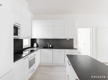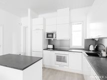 - Varusteet: jääkaappipakastin, pakastin, astianpesukone. Työtaso: laminaattitaso. Liesi: induktioliesi, erillisuuni, liesituuletin. avokeittiö, saareke, komposiittiallas
