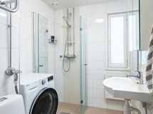 - Pesutilojen varusteet: WC-istuin, suihku, suihkuseinä, pesukoneliitäntä, bidee-suihku, allaskaappi, pesuallas, peilikaappi ja lattialämmitys. Pesutilojen kuvaus: Putkiremontissa uusittu ikkunallinen kylpyhuone.