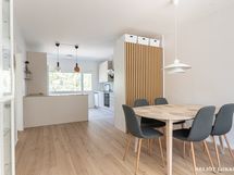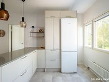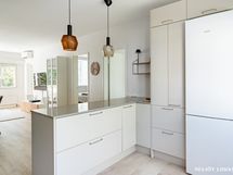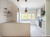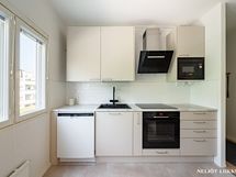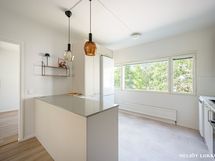 - Keittiön varusteet: Jääkaappipakastin, keittiösaareke, astianpesukone, mikroaaltouuni, liesituuletin, liesi, uuni ja aamiaiskaappi. Liesi: Induktioliesi. Työtason materiaali: Laminaatti ja kvartsi. Täysin uusittu keittiö (3/2023): uudet kaapistot, uudet kodinkoneet, poistettu seinä olohuoneen suuntaan. Saarekkeessa kvartitaso (Noble congrete grey).