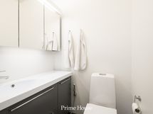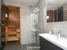 Yläkerran kylpyhuone. Wc-istuin, käsisuihku, suihku, pesuallas, allaskaappi, peilikaappi. Seinät ja lattia laattaa, lattialämmitys. Katto paneelia. WC: Uusittu 2020. Wc-istuin, käsisuihku, pesuallas, allaskaappi ja laatikosto, peilikaappi. Seinät ja lattia laattaa, lattialämmitys. Katto paneelia.