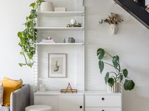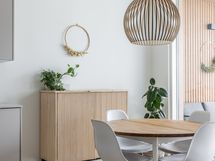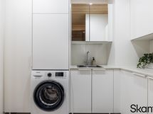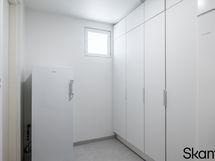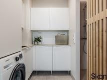 Arkieteisessä ja kodinhoitohuoneessa kaapistot.