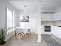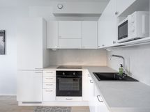 Keittiön varusteet: Erillinen pakastin, erillisuuni, liesi, astianpesukone ja liesituuletin. Liesi: Keraaminen liesi. Työtason materiaali: Laminaatti.