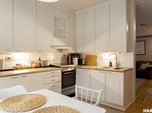 Liesi: sähköliesi. Työtasot: laminaatti. Kylmäsäilytys: jääkaappi/pakastin. Varustus: liesituuletin.