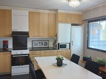Tilaa isolle ruokapöydälle, Laminaattitasot, Astianpesukone, Induktioliesi, Liesituuletin, Jääkaappi, Pakastin