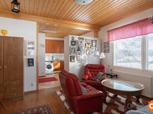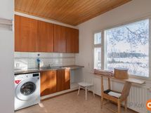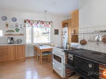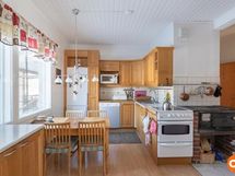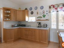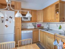 - Jääkaappipakastin, sähköliesi, liesituuletin, mikroaaltouuni, astianpesukone, kaapistot. Puuhella
