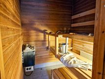 SAUNA: Oma sauna, jossa sähkölämmitteinen kiuas. Lattia laatoitettu, seinät ja katto paneloitu.