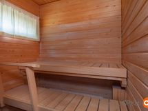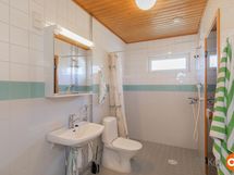 Sauna, sähkökiuas, kylpyhuone, suihku, pesukoneliitäntä.