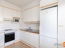 Jääkaappipakastin, sähköliesi, liesituuletin, kaapistot, kiinteät valaisimet.