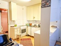 KEITTIÖ: Varustuksena jääkaappi, pakastin, sähköliesi/-uuni ja astianpesukone. Lattiassa parketti ja seinät maalattu. Keittiön jatkeena ruokailutila.