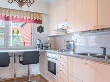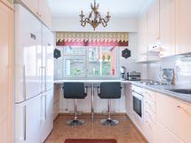 - Keittiön varusteet: Jääkaappi, erillinen pakastin, liesi, liesituuletin ja erillisuuni. Liesi: Valurautaliesi. Työtason materiaali: Laminaatti.