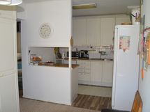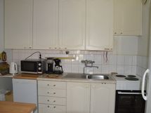 Keittiön varusteet: Liesi (V:lta 2024), jää-viileäkaappi, astianpesukone (V:lta 2024) ja jääkaappi. Liesi: sähköliesi. Työtason materiaali: Laminaatti.