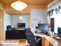 Olohuone on kivasti avattu työhuoneeseen ja nämä keittiön kanssa muodostavat toimivan kokonaisuuden. Kaikissa puulattiat ja paneloidut katot.