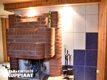 Alakerrassa on iso takkahuone, jossa voi tunnelmoida saunan jälkeen. Tai vaikka käyttää makuuhuoneena, jos tilat muuten loppuu kesken.