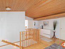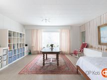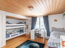 makuuhuonetta. Makuuhuoneet ovat hyvän kokoiset ja niissä on avaruuden tuntua. Tänne saat järjestettyä itsellesi vaikka rauhallisen etätyöskentelypisteen. Kivana bonuksena on oma wc myös tässä kerroksessa.