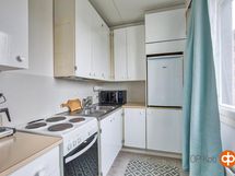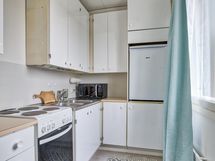 Jääkaappi, sähköliesi, kaapistot, kiinteät valaisimet.