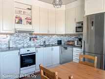 - KEITTIÖ: Keittiössä induktioliesi, liesituuletin, astianpesukone ja jääkaappi/pakastin ja hyvin kaappitilaa. Lattiassa laminaattia, puolipaneeli ja tumma, tiilikuvioinen tapetti. Välitila pinnoitettu mosaiikkijäljitelmällä. Vaaleat keittiökaappien ovet. 2020 uusittu keittiökoneet, keittiön tasot seinät ym.