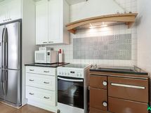 - Jääkaappi/pakastin (side by side), astianpesukone, keraaminen liesi, puuliesi, liesikupu/-tuuletin, kaapistot ja liikuteltava saareke