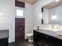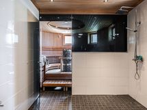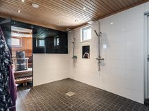Alakerrassa sijaitsevaan upeaan , ympyränmuotoiseen saunatilaan mahtuvat kyllä kaveritkin saunomaan tai isompikin perhe. Saunassa neljä ikkunaa, ympyrän muodossa lauteet ja lasiseinämää pesuhuoneen suuntaan. Myös pesutila on tilava ja kahdella suihkulla varustettu. Pesutilasta on suoraan käynti takapihan puolelle vilpolaan/terassitilaan ja käynti takkahuoneeseen. Takkahuone on keskeneräinen, joka mahdollistaa tilan käyttötarkoituksen muutoksen esim. makuuhuoneeksi, työhuoneeksi tai harrastetilaksi.