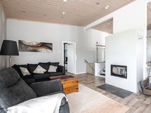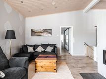 Olohuone on neljä porrasta alempana ja tilan jakaa lasi-kaide ja varaavan takan hormi. Korkea/vinosisäkatto olohuoneessa (2,7m-3,5m) antaa tilan tuntua ja olohuoneesta on näkymät ylätasanteen tiloihin, joka vielä lisää tilan tuntua koko kerrokseen.