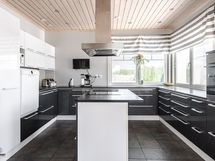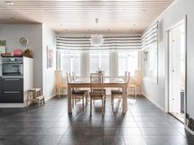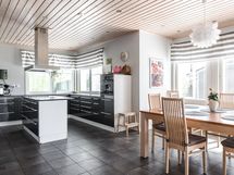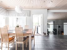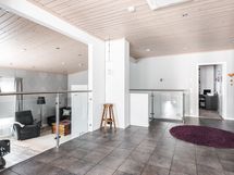 Sisään tullessa vastassa on yläkerran avara keittiön, ruokailutilan ja eteisaulan yhdistelmä.