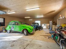Ilmalämpöpumpulla lämmitettävä autotalli tarjoaa tilaa harrasteautoille, ja sähköauton lataus onnistuu tallin omalla latausasemalla.