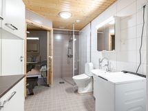 - Pesutilojen kuvaus: Laatoitettu, lattialämmmitys, suihku, suihkuseinä, käsienpesuallas, allaskaappi, wc-istuin, pidesuihku. Erillisten WC:n lukumäärä: 1.