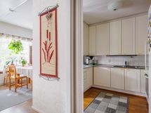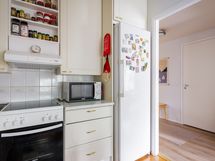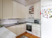 Liesi: sähköliesi. Työtasot: laminaatti, metalli. Kylmäsäilytys: jääkaappi/pakastin. Varustus: varattu paikka astianpesukoneelle, liesituuletin / hormi.