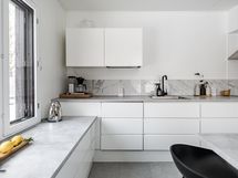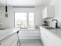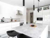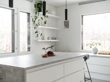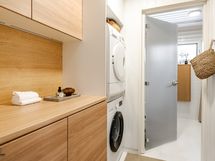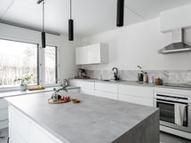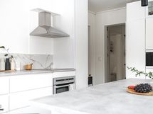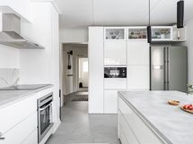 - Keittiön varusteet: Jääkaappi, erillinen pakastin, liesi, liesituuletin, keittiösaareke, astianpesukone, erillisuuni ja mikroaaltouuni. Liesi: Keraaminen liesi. Työtason materiaali: Laminaatti.