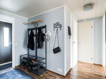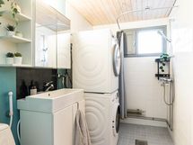 - Saunassa on sähkökiuas, kylpyhuone, peilikaappi, allaskaappi, pesukoneliitäntä ja kiinteät valaisimet.
