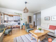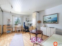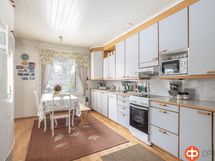 - Jääkaappi kotikylmiö, pakastekaappi, keraaminen liesi, liesituuletin , tuulettimen putki menee öljysäiliötilaan, astianpesukone, kaapistot, pöytätasojen materiaali melamiini.