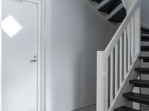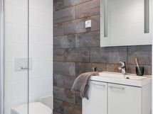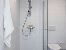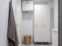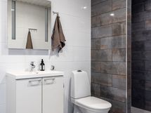 - Pesutilojen kuvaus: Alakerran kylpyhuoneessa suihkuseinä, wc-istuin, lattialämmitys, peili, kylpyhuonekaapisto. Varustus: pesukoneliitäntä, lattialämmitys, wc-istuin, peili, kiinteät valaisimet, kylpyhuonekaapisto.