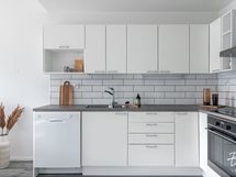 - Liesi: keraaminen, erillisuuni. Kylmäsäilytys: jääkaappi/pakastin. Varustus: liesituuletin, astianpesukone, kiinteät valaisimet.