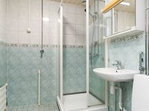 - Pesutilojen kuvaus: Kylpyhuoneen varustus: suihku, suihkukaappi, pesuallas, peilikaappi valaisimella, vesikiertoinen pyyhekuivain, WC-istuin, bideesuihku.