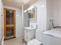 - Pesutilojen kuvaus: Pesuhuone on remontoitu v. 2024 vesijohto- ja kylpyhuonesaneerauksen aikana kokonaan. Suihku, suihkuseinä, pesuallas/laatikosto, peilikaappi, bidee-suihku, wc-istuin ja pesukoneliitäntä, kaikki uusittu. Pesuhuoneessa on päältä täytettävä pesukone mikä kuuluu kauppaan.