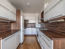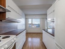 - Kaunis keittiö, pitkät työtasot ylä- ja alakaapistoineen vastakkain, toisella seinustalla sähköliesi ja liesituuletin, toisella jääkaappi/pakastin. Lyhyemmässä työtasossa keittiön päädyssä, tiskipöytä ja astianpesukone, ylä- ja alakaapistot sekä avohylly. Keittiön toisessa päädyssä ruokailutila, pöydälle hyvä tila, iso ikkuna tuo luonnonvaloa.